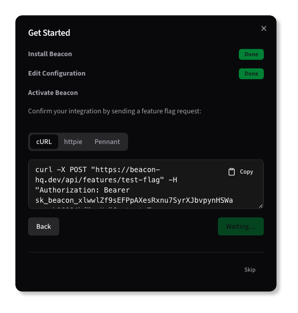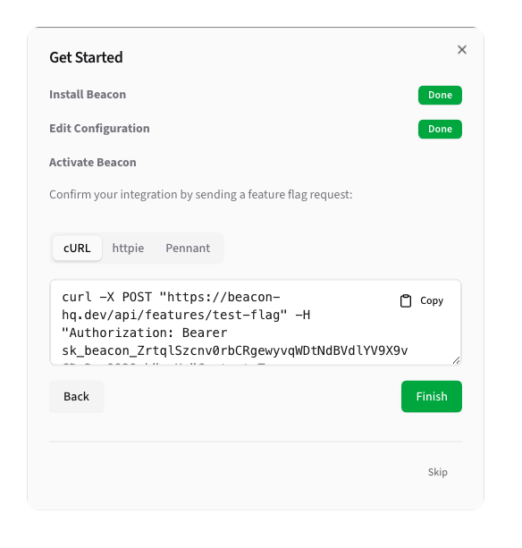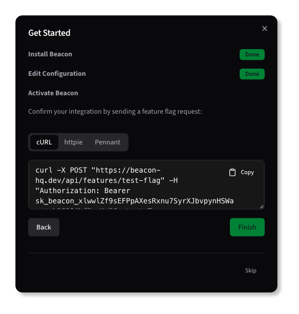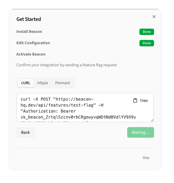 Finally, Beacon will guide you through testing the integration is functional, using cURL, httpie, or Pennant.